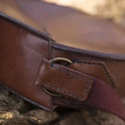 Diese Tasche handgefertigt aus braunem Leder ist, misst er 18 x 23 cm und kann mit einem Gurt geschlossen werden. Die Tasche ist mit Motiven im Art-Stil der Magyaren eingerichtet, genau wie das Original.