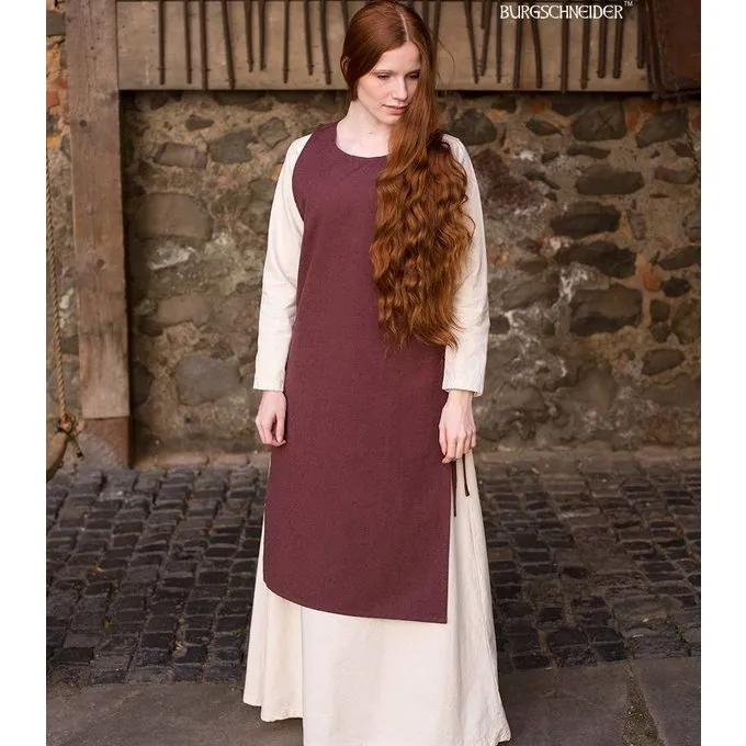 Diese hangeroc ist eine Nachbildung des 9. Jahrhunderts original in Haithabu ausgegraben. Die hangeroc war das Kleidungsstück, die Viking Frauen über ihre Kleidung getragen und sie brachten dieses Kostüm zu Island, Irland, Russland und den britischen Inseln. Die hangeroc wurde oft auf das Kleid mit Schild Broschen oder Scheibenfibeln befestigt ist.