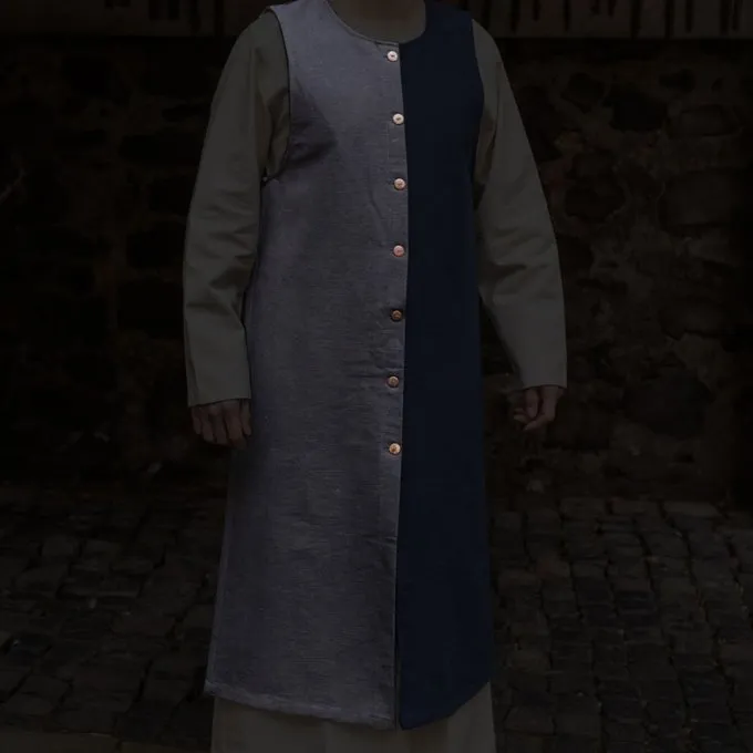 Entdecken Sie die neue Kollektion von Mi Parti Burgschneider! Der Tabard Audic besteht aus zwei Hälften, die getrennt verkauft werden. Auf diese Weise können Sie wie gewünscht einen Mi Parti Tabard komponieren. Befestigen Sie die linke Seite nach rechts mit den Tasten. Wenn Sie sich in verschiedenen mittelalterlichen LARP- und Nachstellungsgruppen befinden, können Sie viele verschiedene Farbkombinationen mit ein paar linken und rechten Seiten herstellen. Der Tabard ist ein Kleidungsstück, das bereits im 12. Jahrhundert gefunden werden kann. Es wurde über den anderen Kleidern getragen, mit viel Heraldik und dekorativen Elementen. Es wurde zum Beispiel von einem Herold getragen, damit man sehen konnte, was die Heraldik war. Sie können auch einen Tabard als Surcoat tragen. Dieser Tabard besteht aus einer schweren Baumwolle mit einer tiefen Farbe, die für alle Wetterbedingungen geeignet ist. Vom 11. bis zum 16. Jahrhundert war der „Mi-Parti“ (teilweise farbige) Kleidungsstil beliebt und verband zwei verschiedene farbige Stoffe in der Mitte. Der Effekt ist ein Farbkontrast, der oft ein dramatisches Aussehen erzeugt. Im Mittelalter war Mi-Parti ein wichtiger Stil unter Umhängen, Leerhau, Kleidern, Hose und Kleidern. Die frühesten Beispiele für diesen Stil stammen aus dem 9. und 10. Jahrhundert, in dem die geteilten Farben für Beine und Schuhe verwendet wurden. Zum Beispiel hatten die Stiefel eine halbe Farbe und die halbe andere Farbe. Im hohen Mittelalter wurde der Mi -Parti -Stil immer beliebter, als Farbsymbolik in Kleidung wichtiger wurde. Die Farben standen oft für einen bestimmten Status oder eine bestimmte Verbindung. Der Stil wurde im 13. und 14. Jahrhundert häufiger, als viele Männer, insbesondere Vasallen, die Waffen ihrer feudalen Herren imitierten. Gegen Ende des 16. Jahrhunderts nahm der Stil allmählich ab.