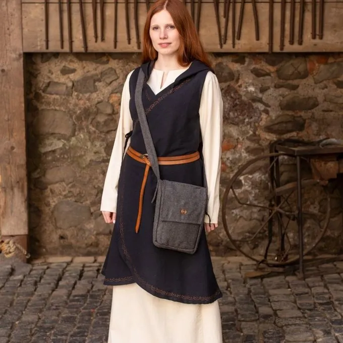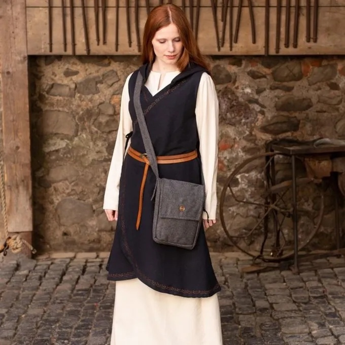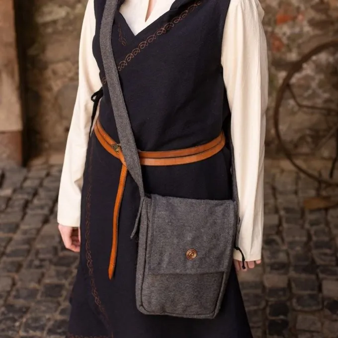 Diese Tasche ist aus Wolle und Sie können es über die Schulter tragen. Sie hat eine Innentasche und eignet sich gut für kleinere Gegenstände zu lagern wie eine Brieftasche und Essen. Auf der Vorderseite hat es eine Bronze in Spiralform paßt. Ein schönes Accessoire für eine Wiederinkraftsetzung Outfit aus der Bronzezeit bis ins Frühmittelalter, oder für Larp oder Cosplay.