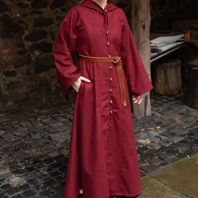 Dieser bezaubernde, lange Mantel besteht aus warmem Wollfilz. Der Tuala -Umhang wird mit seinen außergewöhnlichen Tasten mit festem Messing zusätzliche Aufmerksamkeit auf sich ziehen, die eine lange Knopfplack in einer Reihe bilden. Ein zusätzlicher Knopf im Nackenbereich bietet eine weitere praktische Lösung, um diesen Schicht an kalten Tagen richtig zu schließen. Dieser Mantel hat eine große Kapuze und leicht ausgestellte Ärmel. Es hat zwei fast unsichtbare Taschen auf der Hüfte. Dieses Wollfilmmodell ist besonders für kalte Tage oder kühle Abende geeignet. Das Material ist langlebig, wind und wasserdicht.