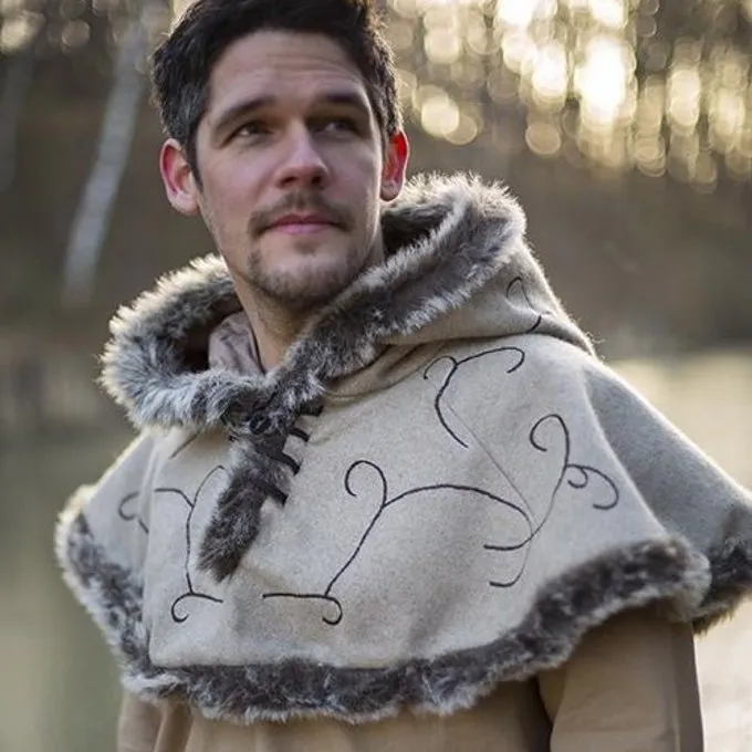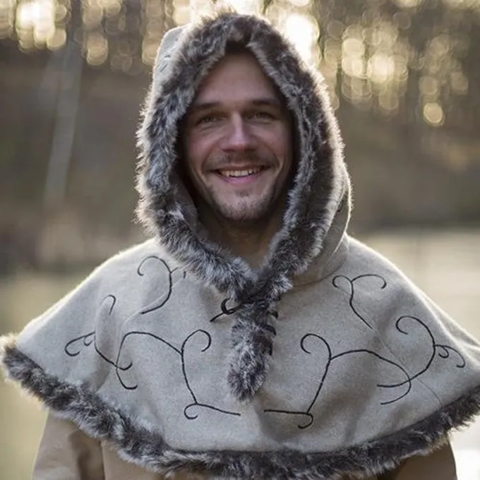 Eine wunderbare warme Haube für die Wintermonate! Diese fantastische Haube ist aus Wollmischung gefertigt und hat einen Polyester Webpelzbesatz. Die Haube ist mit einem dekorativen Muster bestickt. Es ist sehr komfortabel mit einem weichen Baumwollinnenfutter zu tragen. Die Kapuze schützt die Schultern gegen die Kälte und regen. Sie können die Kapuze über den Rücken oder über den Kopf tragen. Die Haube hat eine lange zurück, dies war das übliche Design für mittelalterliche Chaperone. Sie können die Gesichtsöffnung anpassen und machen es kleiner oder größer mit Lederbändern. Diese vielseitigen Luxus-Haube ist ein schönes Accessoire für mittelalterliches Reenactment und verschiedene LARP und Cosplay Zeichen.