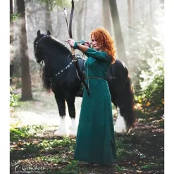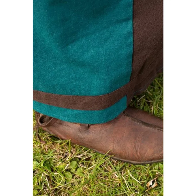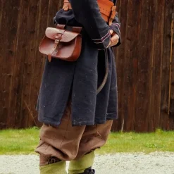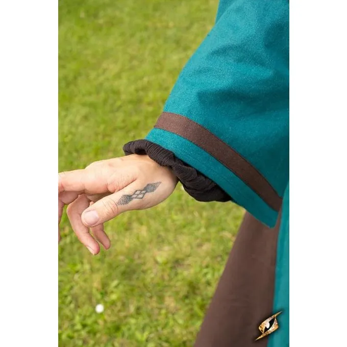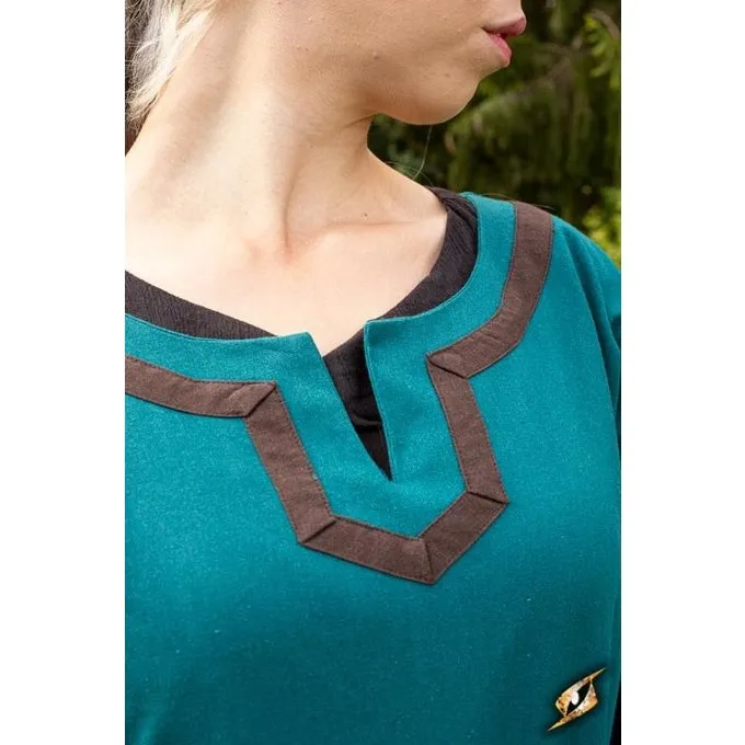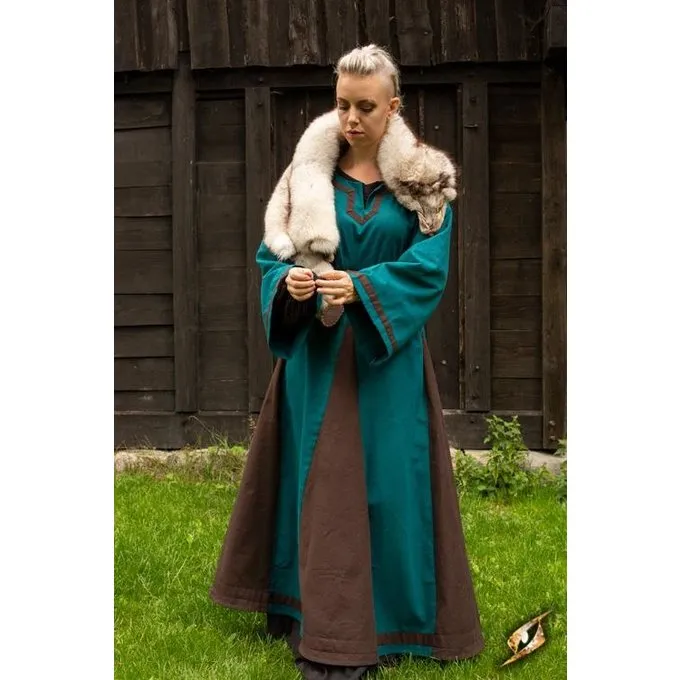 Dieses wunderschöne Wikinger-Kleid basiert auf Ausgrabungen originaler Textilreste aus dem frühen Mittelalter. Kleider wie dieses wurden bei kälterem Wetter alleine oder über einem anderen Kleid getragen. Das Kleid zeigt einen atemberaubenden Kontrast der Farben Azurblau und Braun. Solche Farbkontraste waren im frühen Mittelalter üblich. Das Kleid ist azurblau und der Stoff am Kragen, an den Ärmeln und am Rock ist braun. Zwickel sind dreieckige Stoffstücke, die in den Rock eingenäht werden, um das Kleidungsstück an den Körper anzupassen, den Rock breiter zu machen und mehr Bewegungsfreiheit zu bieten. Zwickel wurden in fast jeder frühmittelalterlichen Kleidung verwendet. Dieses Kleid eignet sich hervorragend für Nachstellungen, historische LARP und Cosplay von Serien wie Vikings oder Last Kingdom.
