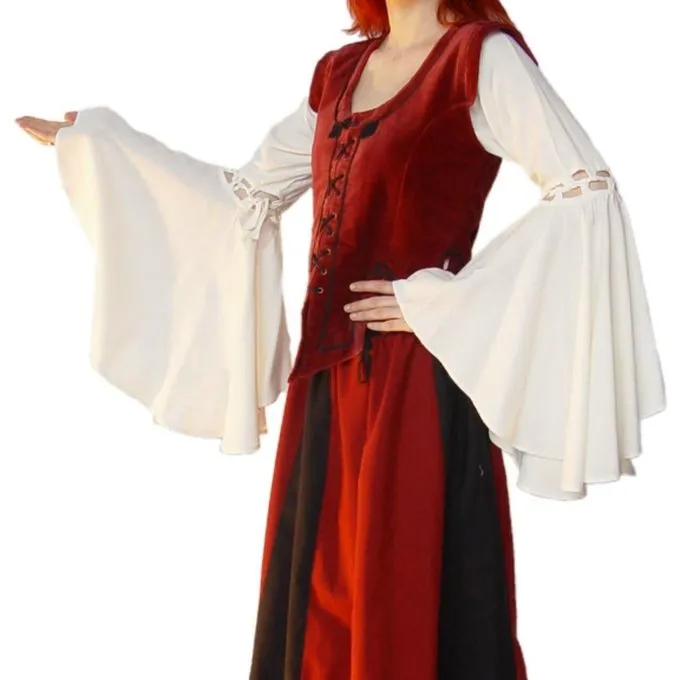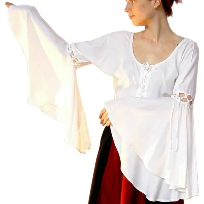 Die Bluse ist aus Viskose und lässt den Bauch Knopf sichtbar. An der Vorderseite kann es mit einer Schnur geschnürt werden, und es hat breite Ende Ärmel. Es ist erhältlich in den Farben rot, schwarz und weiß in den Größen S bis XXXL