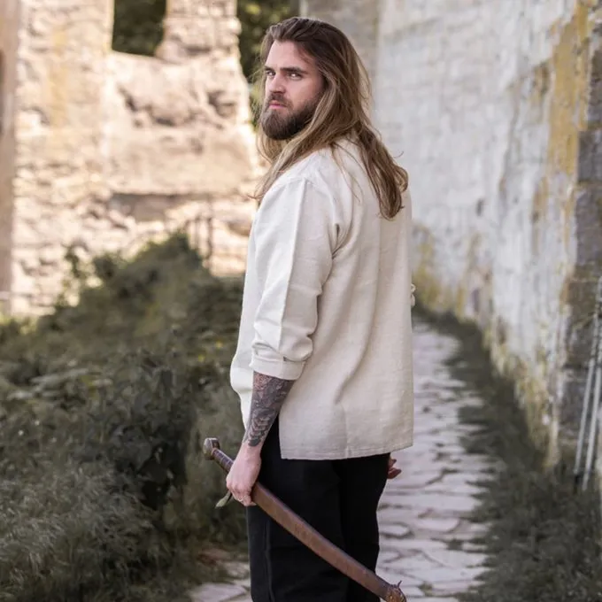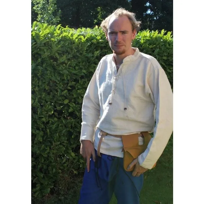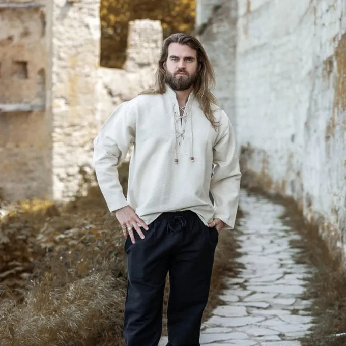 Dieses Shirt ist aus dicker handgewebter Baumwolle. Es kann mit einer Schnur am Ausschnitt geschnürt werden. Es ist in den Farben Creme, Schwarz und Grau in den Größen S bis XXXL.