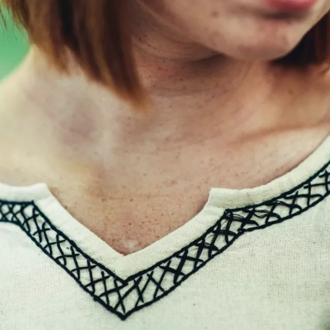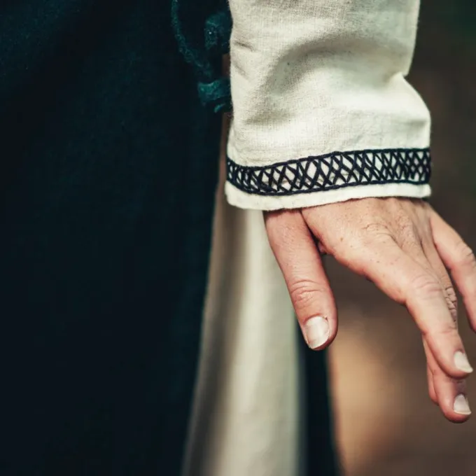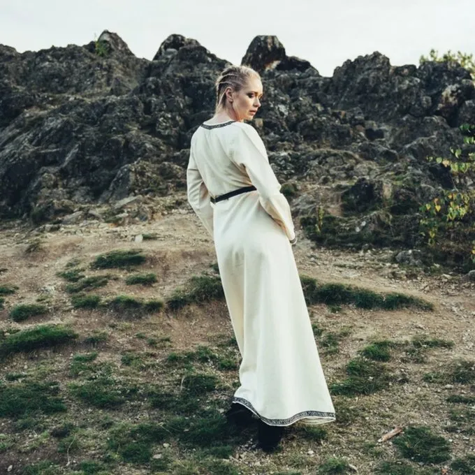 Dieses Kleid basiert auf frühmittelalterlichen Bildern in Manuskripten, Skulpturen und anderen frühmittelalterlichen Formen der bildenden Kunst. Unten, an den Ärmeln und am Ausschnitt hat das Kleid eine gestickte Zierborte im frühmittelalterlichen Stil. Dieses Kleid ist perfekt für Nachstellungen und LARP von Angelsachsen, Wikingern, Merowingern, Karolingern und anderen frühmittelalterlichen europäischen Kulturen. Ideal auch für Cosplay von Serien wie Last Kingdom oder Vikings.