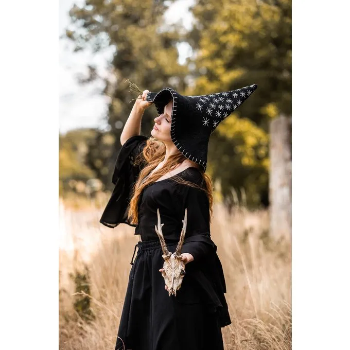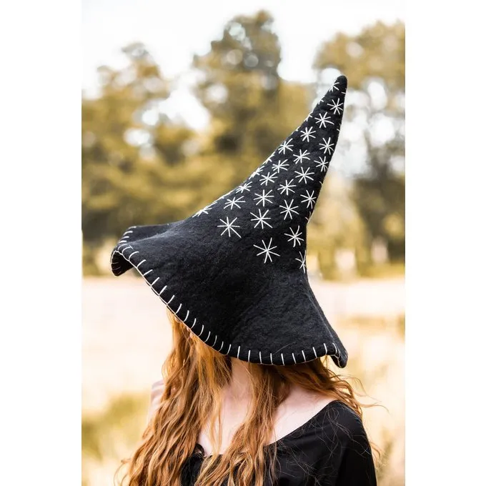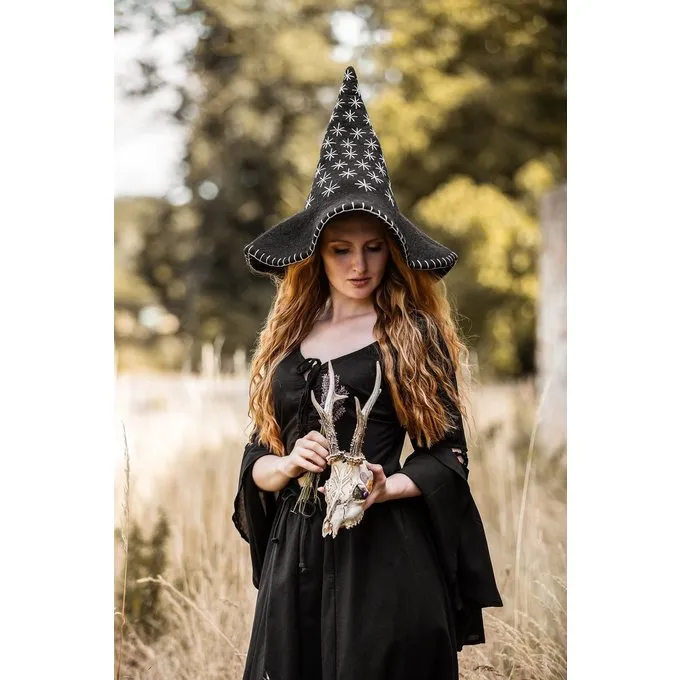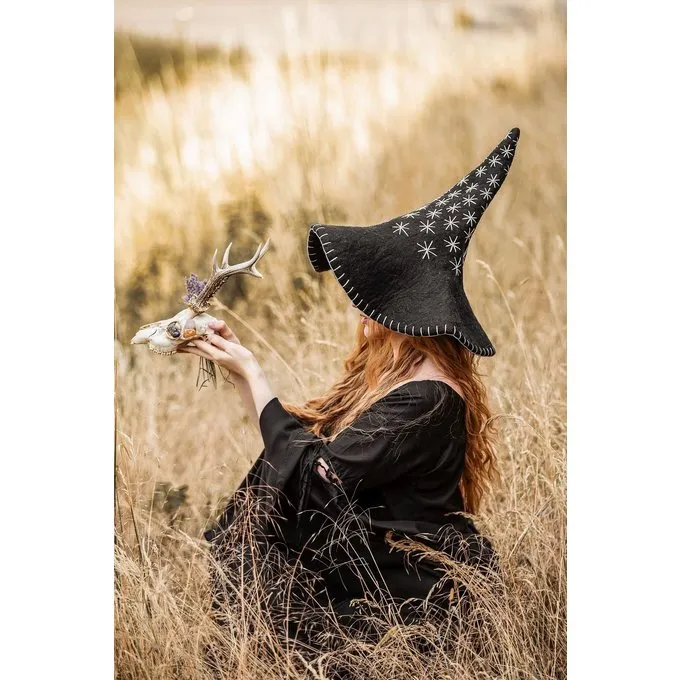 Dieser luxuriöse Hexenhut ist ein unverzichtbares Accessoire für jede Hexe. Der Hut besteht aus Wollfilz und hat einen extra breiten Rand, sodass Sie Ihre Haare oder Ihr Gesicht besser verbergen können. Es bietet auch die Möglichkeit, Filialen zum Beispiel in den Hut einzubeziehen.