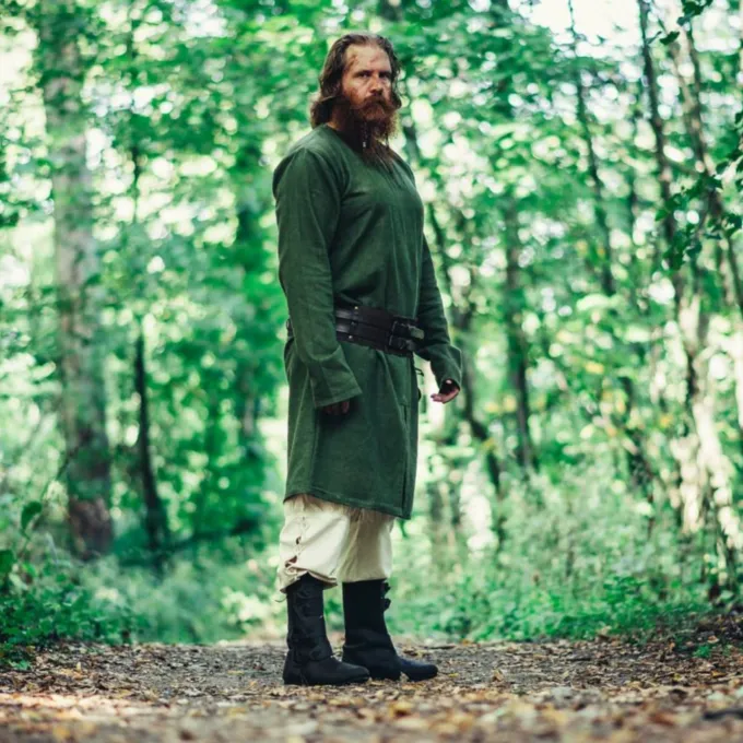 Diese Tunika basiert auf Kleidungsstücken, die im frühen Mittelalter von Wikingern und anderen Völkern in Nordwesteuropa getragen wurden. Aufgrund des universellen Designs eignet es sich auch für mittelalterliche Nachstellungen. Sie können die Tunika selbst tragen oder bei kälterem Wetter mit einer Unterwäsche kombinieren. Diese lange Wikinger Tunika reicht bis zu den Knien. Es hat einen V-Ausschnitt und einen Schlitz auf der Vorder- und Rückseite für ultimativen Tragekomfort bei Gefechten usw. Sie können die Tunika mit einem Gürtel kombinieren, um eine bessere Passform zu erzielen, oder Sie können die Tunika mit einem Gürtel kürzen, indem Sie einen Teil des Gürtels drapieren Stoff darüber. Während des frühen Mittelalters wurden alle Arten von Gegenständen am Gürtel getragen, wie Taschen, Messer, Äxte usw.