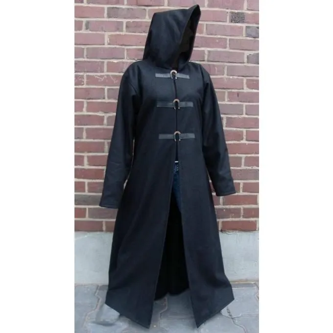 Dieser schwarze, wird langer Mantel aus Wolle und ist mit Baumwolle gefüttert. Es ist mit Baumwolle gefüttert. Es kann mit drei Riemen an der Front geschlossen werden und es eine Haube hat. Es ist in den Größen S bis XXXL erhältlich.