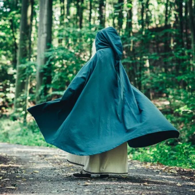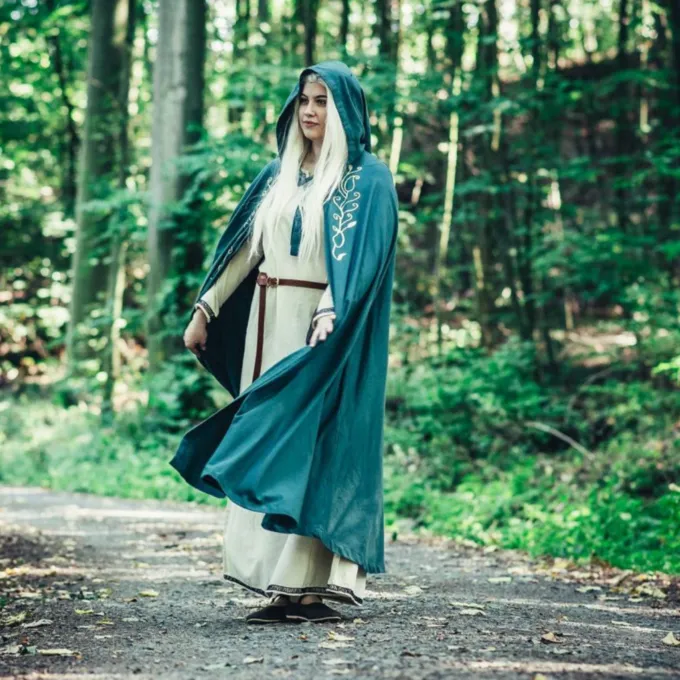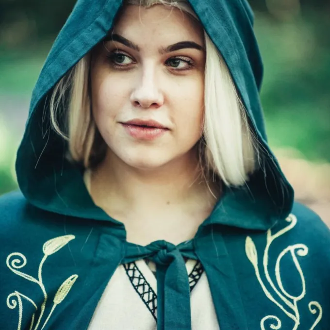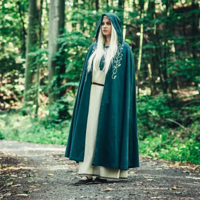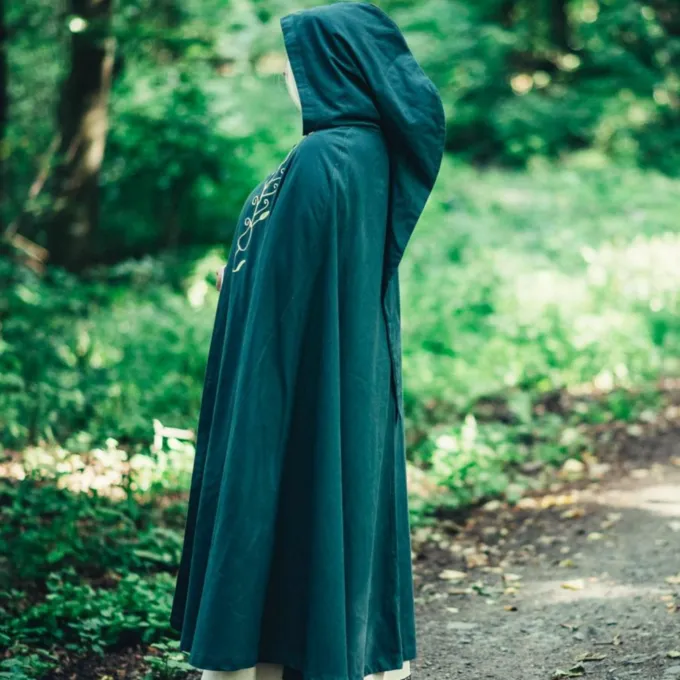 Das elegante Mantel bietet einen feinen Schutz vor Wind und kühle Abenden im Frühling, Sommer und frühen Herbst. Ein großer Gewinn für Ihre Fantasie oder historisches Kostüm! Der Mantel hat ein gestickten organische Rebe Motiv auf beiden Seiten. Sie können den Mantel mit dem Knopf für einen angenehmen Tragekomfort befestigen. Der Mantel hat eine kurze Haube.