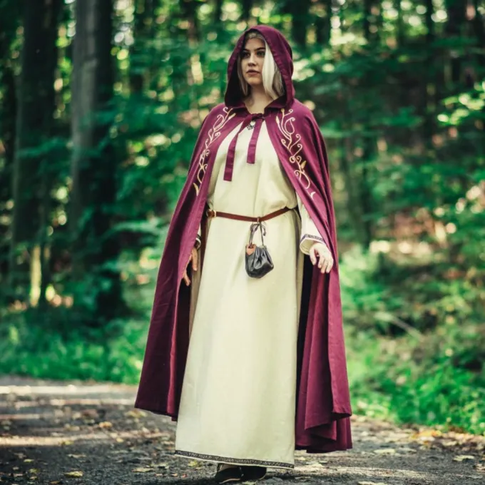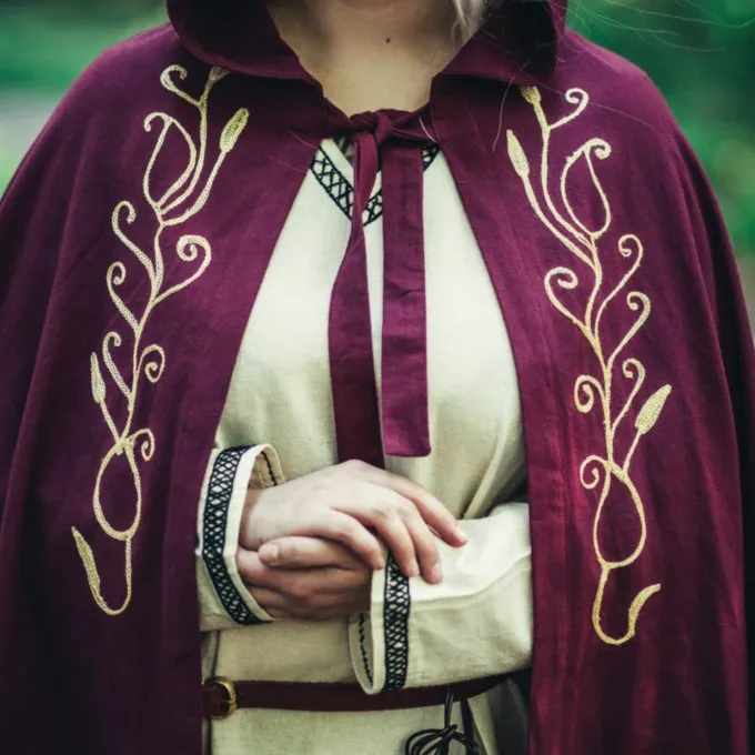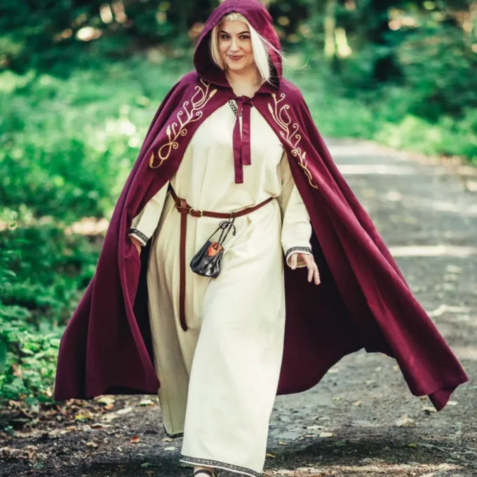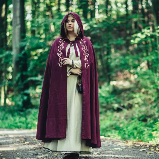 Das elegante Mantel bietet einen feinen Schutz vor Wind und kühle Abenden im Frühling, Sommer und frühen Herbst. Ein großer Gewinn für Ihre Fantasie oder historisches Kostüm! Der Mantel hat ein gestickten organische Rebe Motiv auf beiden Seiten. Sie können den Mantel mit dem Knopf für einen angenehmen Tragekomfort befestigen. Der Mantel hat eine kurze Haube.