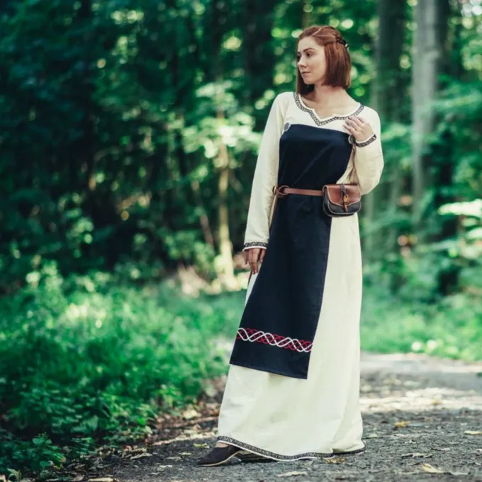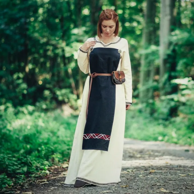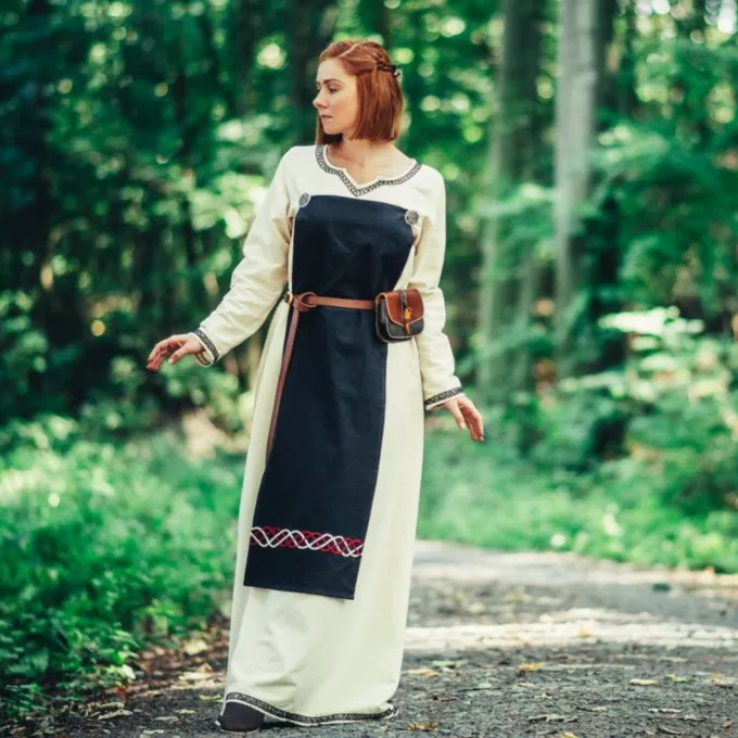 Diese schmale und längliche Schürze ist wunderschön mit gestickten Mustern auf dem Boden eingerichtet. Viking Frauen trugen solche Schürzen ihre Kleider vor Schmutz zu schützen. Sie können die Schürze um Ihr Kleid mit Broschen oder Stiften befestigen. Hinweis: Broschen sind nicht enthalten. Ein perfektes Kleidungsstück zu vervollständigen Ihr Viking Kostüm!