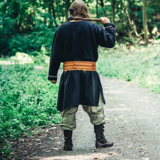 Diese Tunika eignet sich perfekt für frühmittelalterliche Nachstellungen, LARP und Cosplay. Es reicht knapp über die Knie und ist mit schönen Stickereien verziert. Die Ärmel haben ein symmetrisches Muster, das aus zwei gewundenen roten Linien und zwei gewundenen weißen Linien besteht. Diese Stickerei bildet einen ästhetischen Kontrast zum Stoff der Tunika und der Stickerei am Ausschnitt. Diese Stickerei zeigt einen Wolf in der Mitte mit einem frühmittelalterlichen Knotenmotiv auf beiden Seiten in Weiß, Orange und Rot. In der altnordischen Mythologie war der Wolf Fenrir ein Sohn von Loki, dem Täuschungsgott der Wikinger. Fenrir wuchs als schlauer und sehr starker Wolf auf, eine große Gefahr für die Götter. Aus diesem Grund ketteten sie Fenrir mit Gleipnir an: eine feine Kette, aus der sich Fenrir bis zur Ankunft von Ragnarok nicht befreien konnte. Sowohl in der Kunst der Wikinger als auch der Germanen wurden Wölfe in Kampfszenen dargestellt, genau wie Raben und Adler. Der Wolf stand für Mord, Totschlag und List. Gefährliche Männer wurden als Wölfe bezeichnet, Berserker wurden auch mit Wölfen in Verbindung gebracht. Die Dekoration dieser Tunika passt gut zu der Nachstellung eines Wikinger-Kriegers auf dem Schlachtfeld.