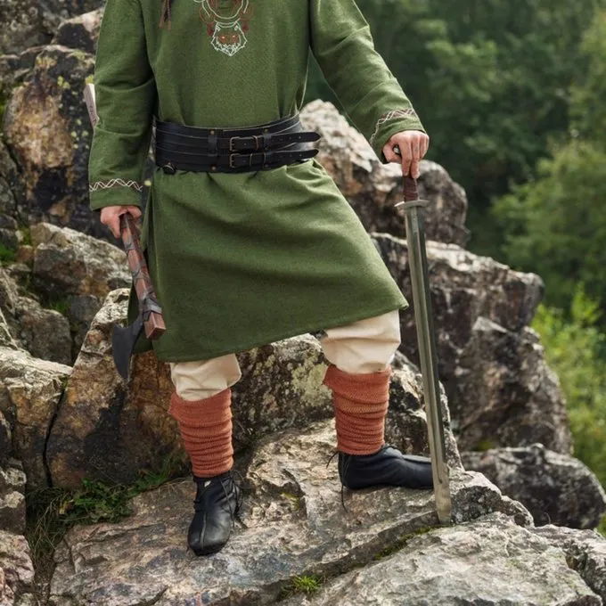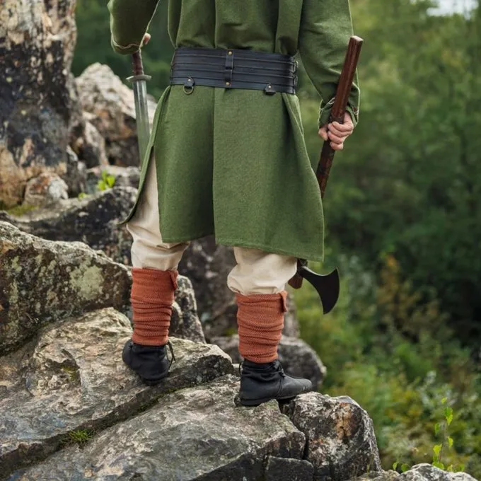 In den kalten Wikingerklimas des Nordens wurden Beinverpackungen über die Hose verwendet. Dies hält die Beine an kalten Tagen besonders warm. Winingas kann um die Beine vom Knie bis zum Knöchel umwickelt und mit einer Fibula befestigt sein. Perfekt für historische Wikingerkostüme, Larp, Cosplay und Reenactment. Diese Beinverpackungen haben ein historisches Heringsnenmuster und bestehen aus starker Baumwolle. Sie werden paarweise geliefert und sind 3,5 Meter lang.