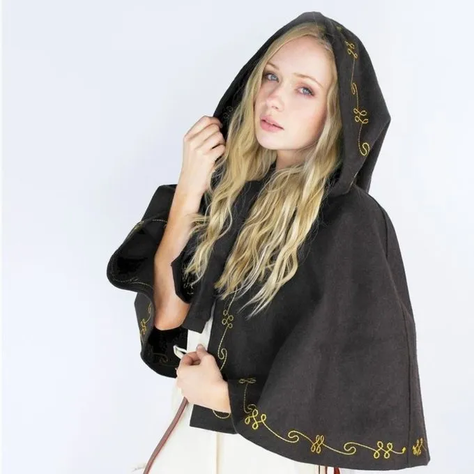 Das Chaperon ist ein mittelalterliches Kopfbedeckung, die vor allem durch die unteren Schichten der Gesellschaft in den frühen Mittelalter getragen wurde. Gegen Ende des Mittelalters, reich Leute begannen auch modisch Chaperone zu tragen. Das luxuriöse Chaperon aus einer Wollmischung und schützt den Kopf, Nacken und Schultern gegen Wind, regen und kalt. Ein schönes Accessoire für, wenn Sie im Winter nachspielen oder LARPing werden oder einfach nur an einem kalten Tag. Das Chaperon ist wunderschön mit gestickten Rebe-Muster an den Rändern verziert. Sie können die Chaperon mit den Wollschnüren befestigen, so dass sie bequem an seinem Platz bleibt. Es hat eine langen zackige Kapuze im mittelalterlichen Stil.