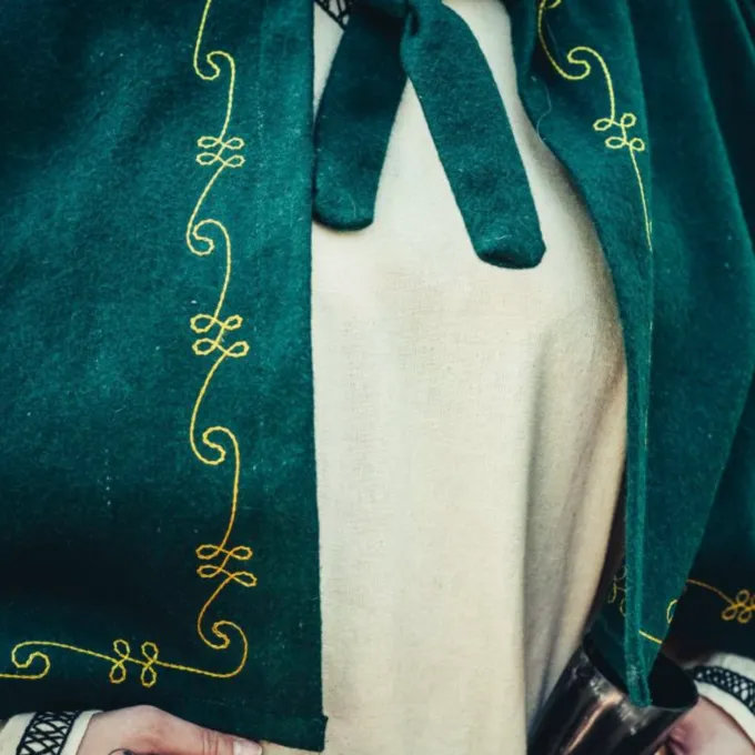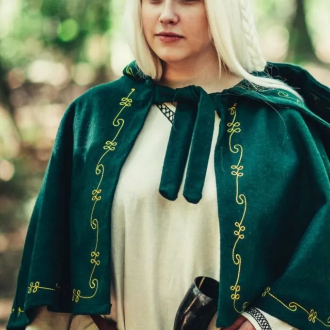 Das Chaperon ist ein mittelalterliches Kopfbedeckung, die vor allem durch die unteren Schichten der Gesellschaft in den frühen Mittelalter getragen wurde. Gegen Ende des Mittelalters, reich Leute begannen auch modisch Chaperone zu tragen. Das luxuriöse Chaperon aus einer Wollmischung und schützt den Kopf, Nacken und Schultern gegen Wind, regen und kalt. Ein schönes Accessoire für, wenn Sie im Winter nachspielen oder LARPing werden oder einfach nur an einem kalten Tag. Das Chaperon ist wunderschön mit gestickten Rebe-Muster an den Rändern verziert. Sie können die Chaperon mit den Wollschnüren befestigen, so dass sie bequem an seinem Platz bleibt. Es hat eine langen zackige Kapuze im mittelalterlichen Stil.