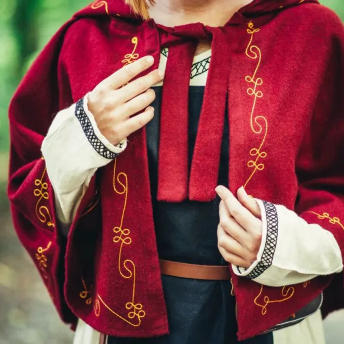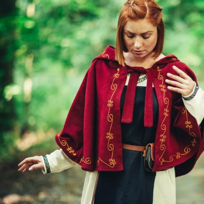 Das Chaperon ist ein mittelalterliches Kopfbedeckung, die vor allem durch die unteren Schichten der Gesellschaft in den frühen Mittelalter getragen wurde. Gegen Ende des Mittelalters, reich Leute begannen auch modisch Chaperone zu tragen. Das luxuriöse Chaperon aus einer Wollmischung und schützt den Kopf, Nacken und Schultern gegen Wind, regen und kalt. Ein schönes Accessoire für, wenn Sie im Winter nachspielen oder LARPing werden oder einfach nur an einem kalten Tag. Das Chaperon ist wunderschön mit gestickten Rebe-Muster an den Rändern verziert. Sie können die Chaperon mit den Wollschnüren befestigen, so dass sie bequem an seinem Platz bleibt. Es hat eine langen zackige Kapuze im mittelalterlichen Stil.