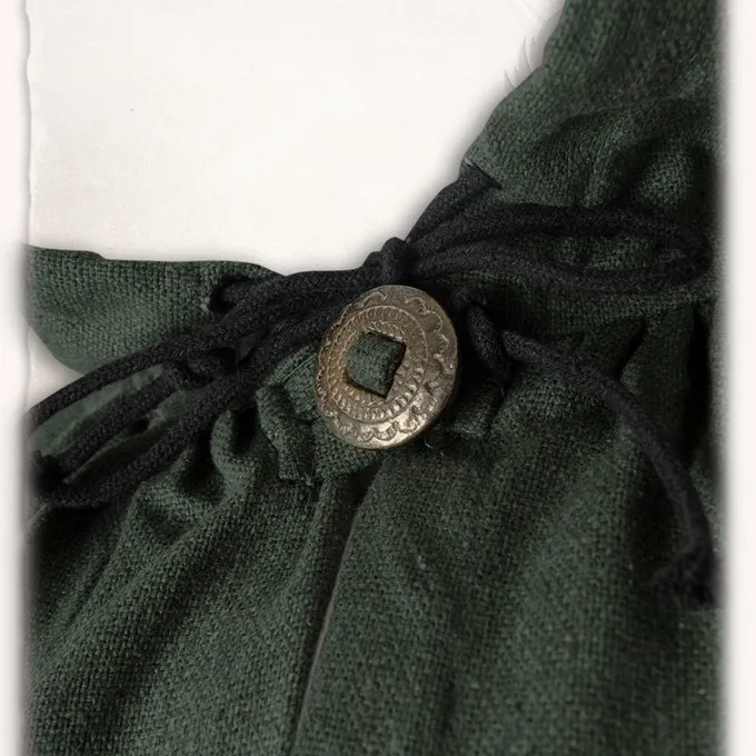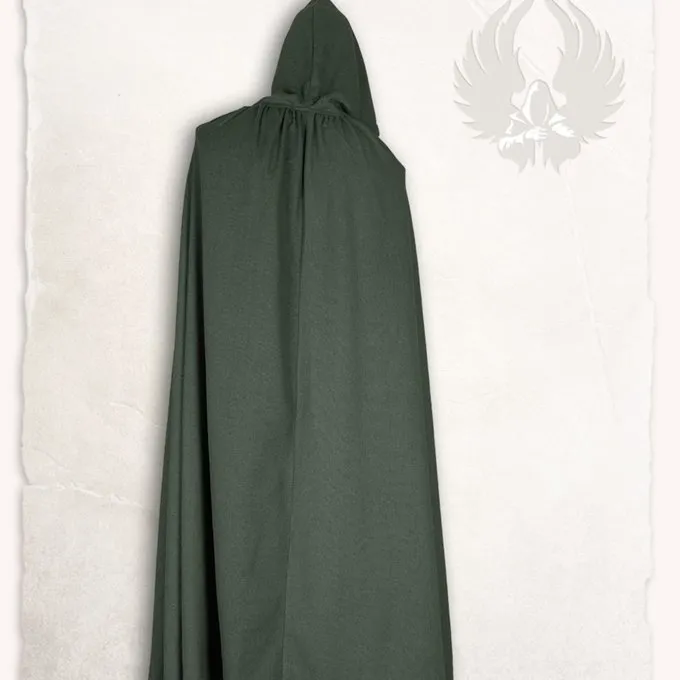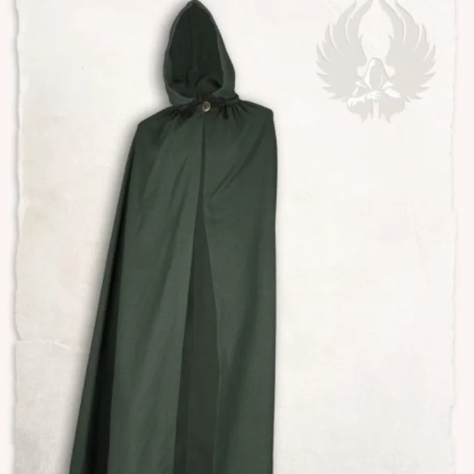 Dieser Mantel eignet sich für Reenactment, Cosplay und Larp. Es besteht aus Baumwollkanänen, die den Träger vor Regen und Wind schützt. Der Mantel hat einen klassischen Schnitt und ist mit einer großen Kapuze ausgestattet. Der Mantel kann mit einem Knopf geschlossen werden. Insgesamt ist dieser Mantel bereit, dein treuer Begleiter zu werden!