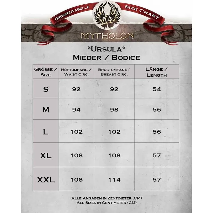 Das „Ursula“ -Beor ist an kühlen Tagen über eine Unterwäsche oder Kleidung getragen und schützt vor leichtem Regen. Das Mieder kann locker als Weste oder festgeschnürt und mit der Schnürung an der Vorderseite geschlossen und in die gewünschte Form gebracht werden.