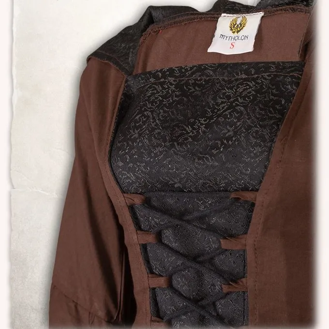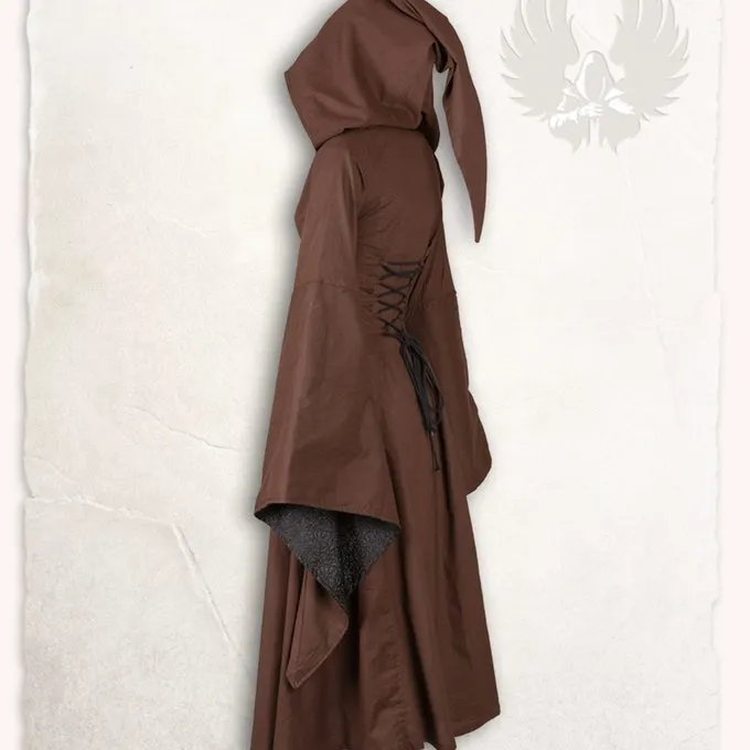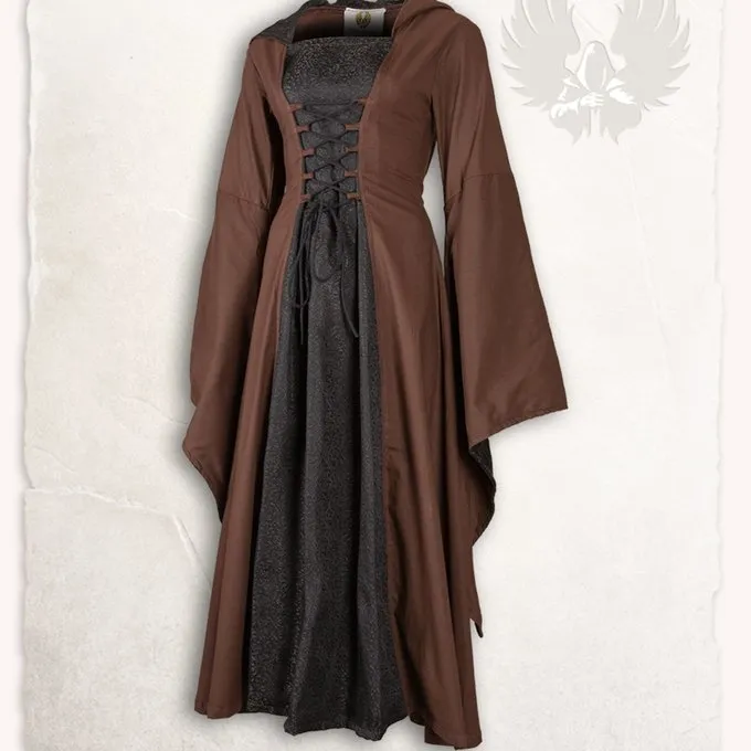 Dieses Kleid eignet sich für Reenactment, Cosplay und Larp. Das Kleid besteht aus Baumwoll- und Damast-Stoff. Das durchlässige Stoff macht das Kleid ideal für wärmere Tage. Das Kleid hat zwei Schnürsenkel, eine an der Vorderseite und einen nach hinten. Dies stellt sicher, dass das Kleid optimal an die Figur des Trägers angepasst werden kann. Das Kleid hat eine breite Kapuze, die dem Kleid zusätzlich Charakter und ein mystisches Gefühl gibt. Die Trompetenhülsen und Mitte sind mit Damast-Stoff ausgekleidet und geben dem Kleid einen eleganten Charakter.