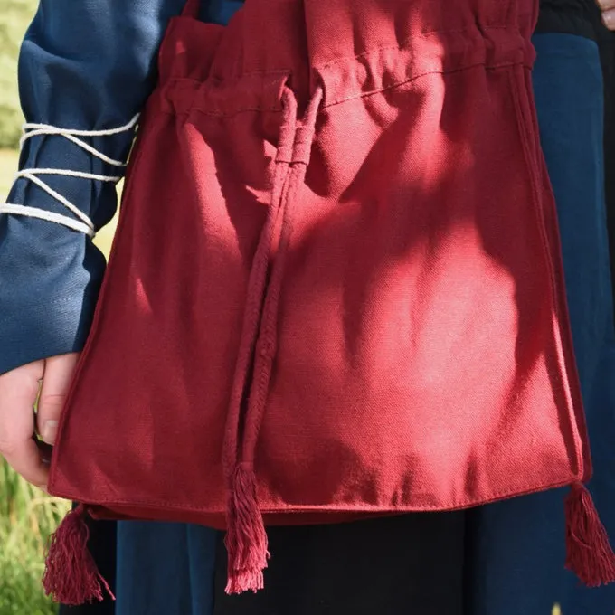Diese Umhängetasche basiert auf Bilder in mittelalterlichen illuminierten Handschriften und Buntglasfenstern. Schultertaschen waren eine häufige Art von Tasche im Mittelalter und waren eine gute Alternative zu den kleineren Beuteln oder Gürteltaschen. Die Menschen könnten mehr Dinge in Schulterbeuteln lagern, dies war besonders nützlich, wenn jemand auf einer langen Reise ging wie eine Pilgerreise. Auch im Alltag war es manchmal sinnvoll, eine größere Tasche zu tragen, zum Beispiel Landwirte mit ihnen Essen nahmen, als sie auf dem Land zur Arbeit ging. Pilger schmückten ihre Taschen mit Pilgerzeichen. Diese Tasche ist aus strapazierfähiger Baumwolle und perfekt für mittelalterlich Reenactment, LARP und Cosplay. Der 6 cm breite Gurt ist mit einem schönen Flechtmuster verziert. Die Tasche hat auch drei dekorative Quasten an der Unterseite.